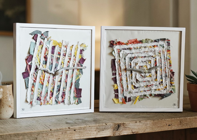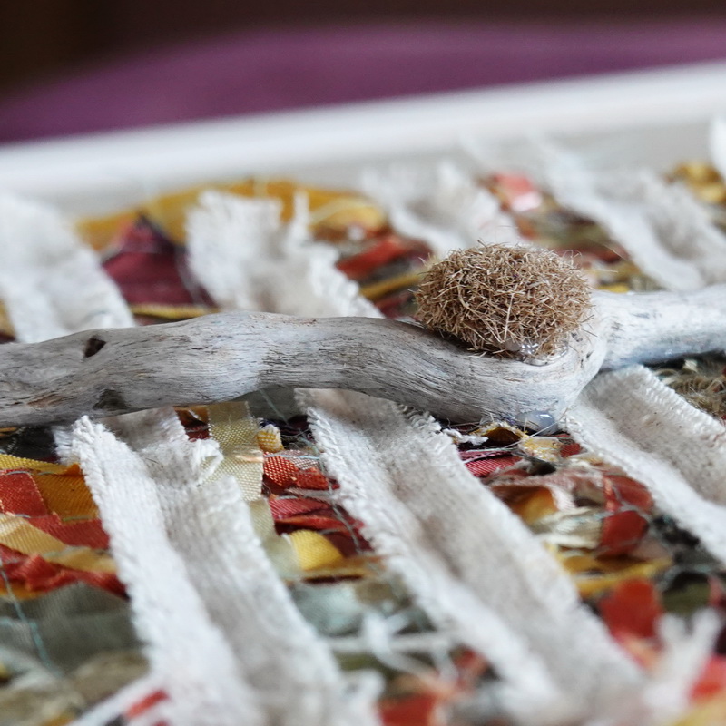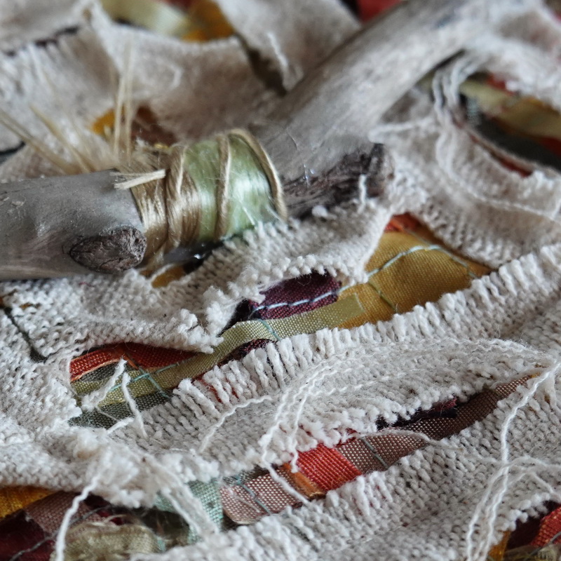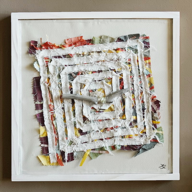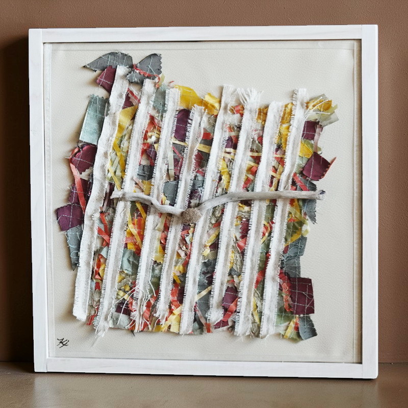 Chaque élément de ce diptyque est issu d’un travail d’assemblage minutieux de textiles variés : coton, soie et autres matières récupérées. Les franges volontairement laissées libres apportent relief et vibration, tandis que les fragments colorés en arrière-plan créent une profondeur subtile.