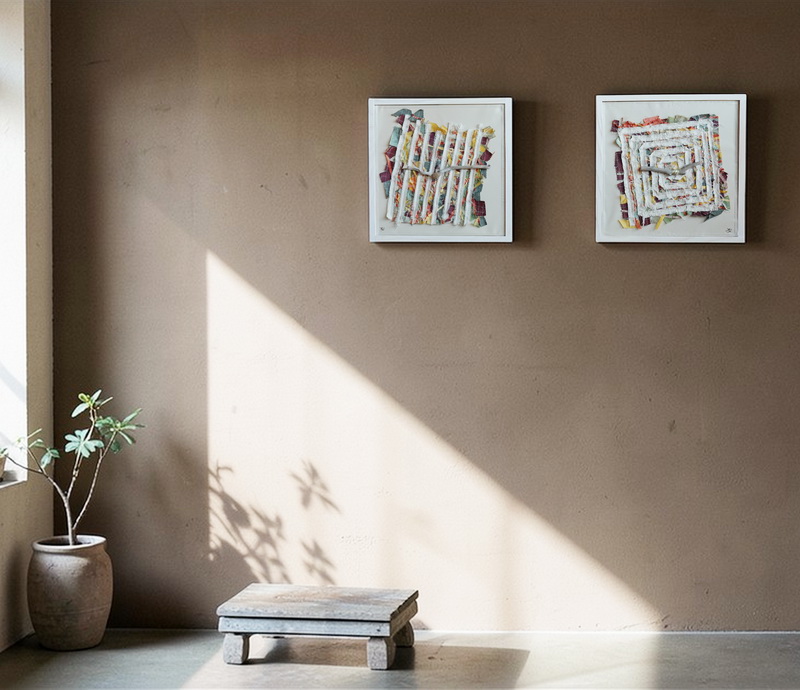 Ce diptyque textile contemporain signé KomJaim explore le dialogue entre matière, structure et émotion. Réalisées à la main à partir de chutes de tissus revalorisées, ces deux pièces uniques composent un ensemble à la fois organique et équilibré.