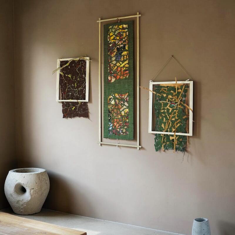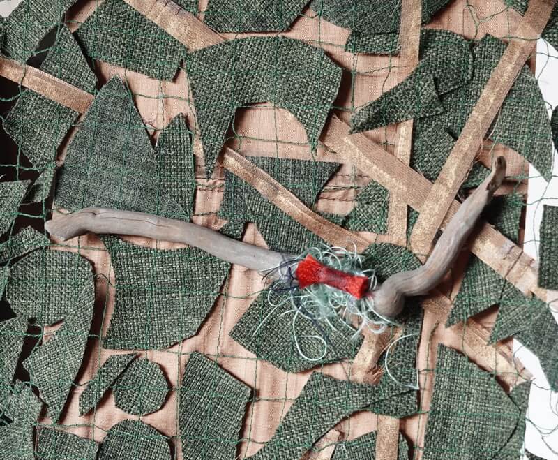 Des filaments textiles relient les formes entre elles, évoquant une croissance libre, proche du lierre ou d’un réseau vivant.