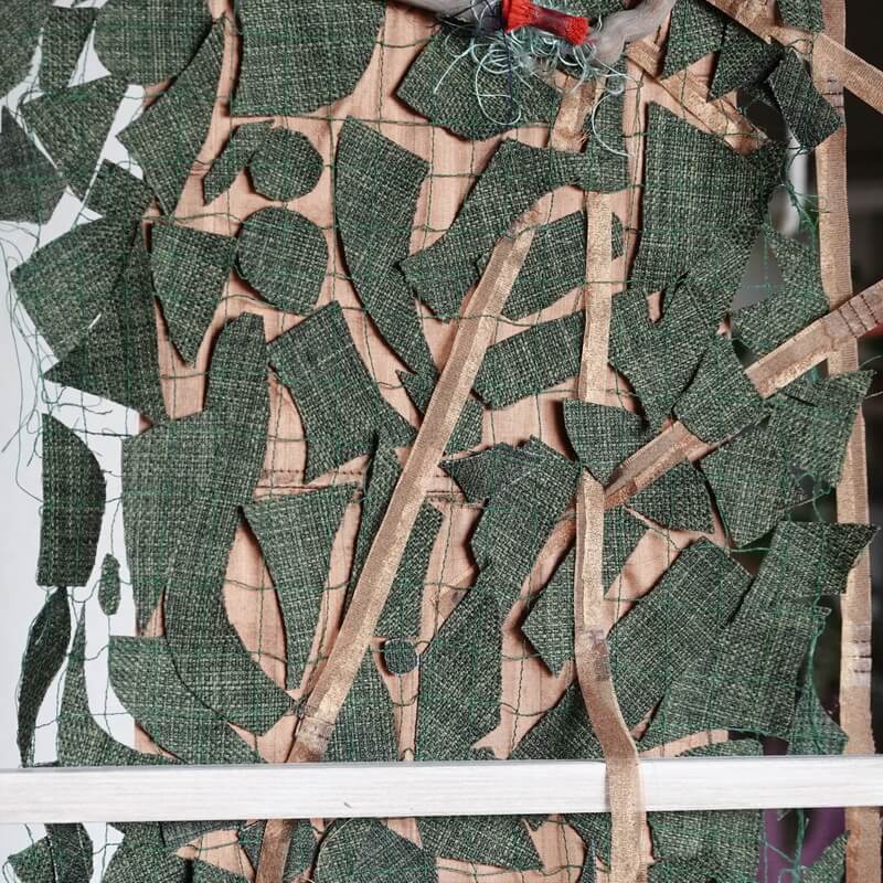 Chaque élément, initialement découpé, est réassemblé puis cousu à l’aide d’un support soluble. Une fois libérés, les fragments conservent la trace de leur origine, tout en formant une nouvelle structure.