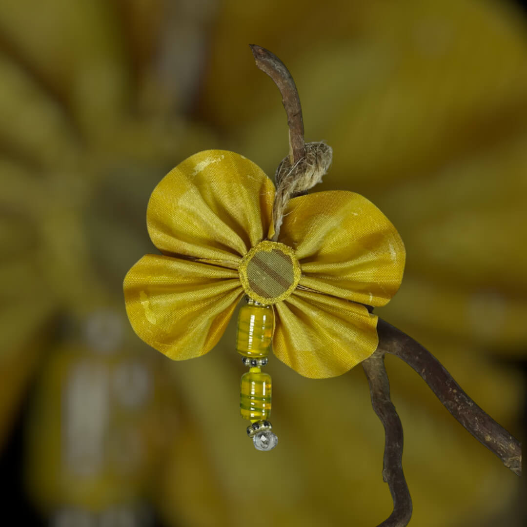 Le papillon, avec ses ailes souples en tissu jaune pastel et ses perles vertes délicatement assemblées, évoque la douceur d’un matin ensoleillé. À ses côtés, la petite fleur corail et rosée dévoile un plissé raffiné, offrant un contraste dynamique et pétillant. Ensemble, ils composent une scène décorative harmonieuse, entre éclat solaire et fraîcheur florale.